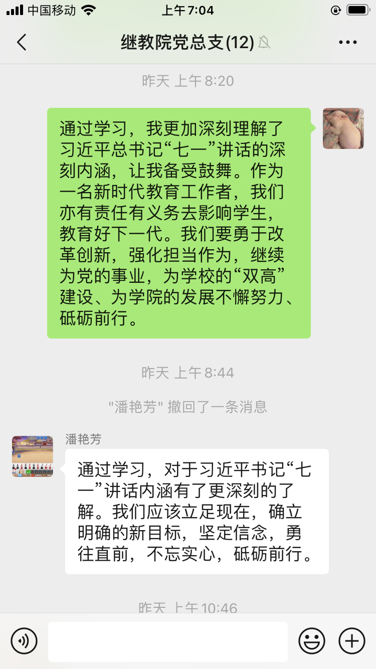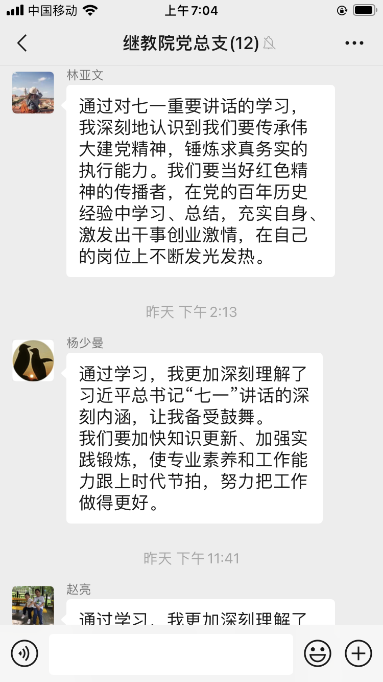 二、继续教育学院党支部的全体党员在党总支微信工作群交流学习习近平总书记“七一”重要讲话并发表心得体会。