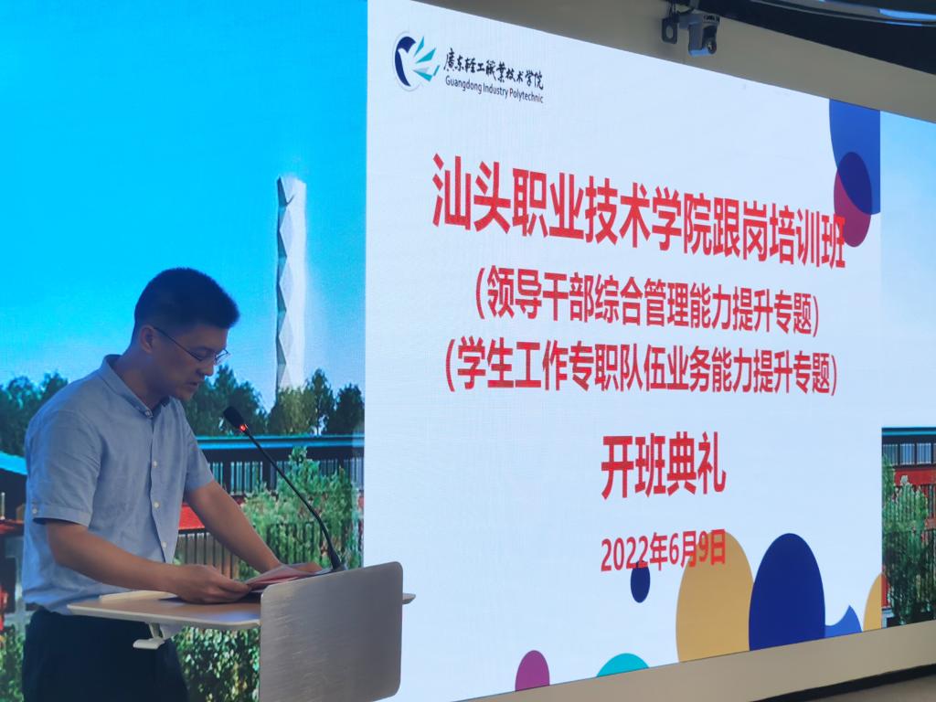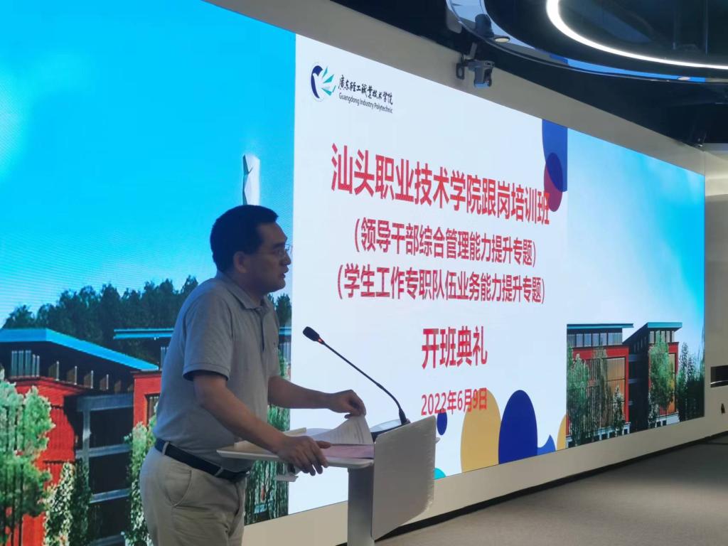 汕头职业技术学院跟岗培训班的两个专题项目在2022年6月8日成功开班,并于6月9日上午在广州新港校区第二实训楼2楼多功能展示中心举办了开班典礼。学校党委办公室主任黄华、人事处处长石朝阳、继续教育学院院长陆英杰、各对接部门负责人、培训班工作人员以及全体参训学员参加了典礼。